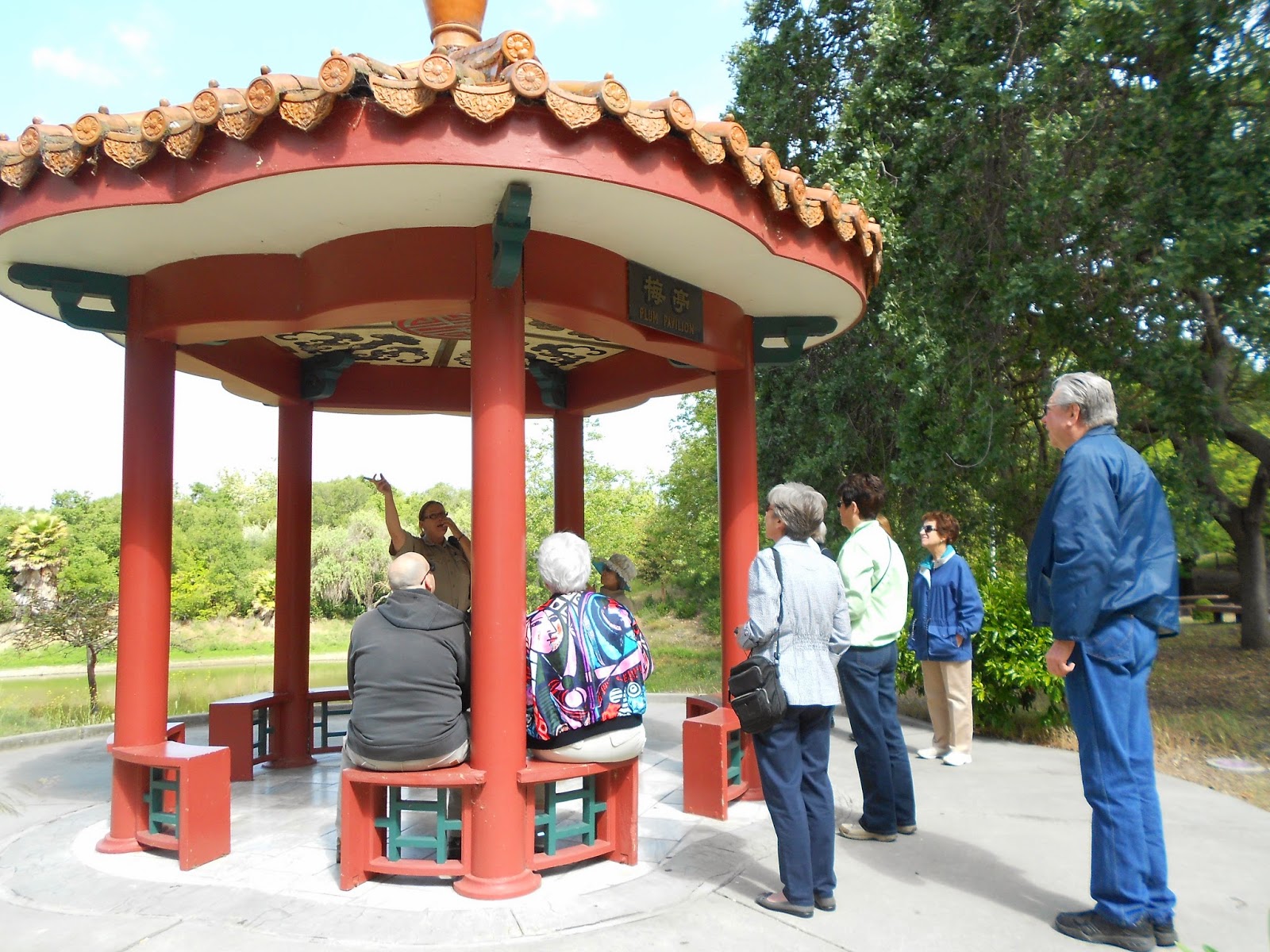 On 5/7/14 Eleven Ramblers joined the journey to the Far East tour of the Overfelt Gardens on Mckee Rd in San Jose with a guided tour by Ranger Valeri Heyberger. The 33 acres of land was donated by Mildred Overfelt in memory of her parents, William and Mary to create a peaceful and tranquil park surrounded by natural plants, wildlife and ponds. The park is also known as the Chinese Cultural Garden due to Frank and Pauline Lowe who worked to acquire several historical objects from Taiwan including: a 30 ft bronze and marble statue of Confucious, an ornamental front gate, Sun Yat Sun Memorial Hall, Chung Kai Shek Plum Pavillion, a sundial and the Black Stone which was mined from the Mt. ranges of Taiwan.We also toured the Overfelt family house located in the park. Afterwards, we visited Pao Hua Buddhist Temple on our own which is located also on McKee Rd. Everyone enjoyed a Dim Sum lunch at Creekside Chinese Restaurant on Piedmont Rd before going home.