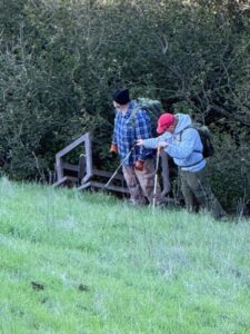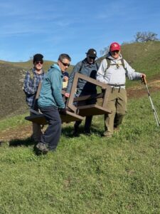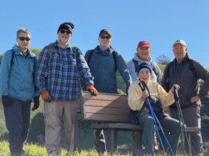 Seven resourceful hikers diverted from the normal hill hike to look for a missing bench on Meadow trail just below the top of Bay trail. Upon reaching the empty site, the bench was quickly visually located in the bushes far down the steep north slope. Several hikers carefully went down the slope and pulled the bench out of the bushes, and then carried it up to the Meadow trail. It will be re-installed when proper ground anchoring can be arranged. The criminal who displaced the bench was likely Mother Nature during the high winds from the storms over the last few weeks. In the 6-person group picture, the 7 hikers are (L-R) Julian, Jim, Steve, Bob and Gordon, with Gigi sitting on the bench and Joel behind the camera.