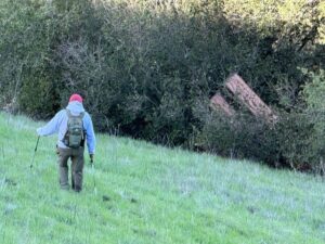Twenty-five people joined the Hill Hike today on a cold morning. Later, some of us caught a glimpse of a bobcat on Upper Meadow near the top of Bay. After that, a group of us went a short distance further down Meadow to look for the missing bench.