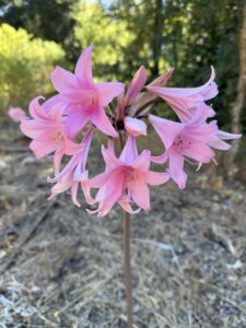 The Tuesday hike to Bear Creek Redwoods Preserve was very enjoyable. Within the first mile we were greeted by dozens of naked ladies (the flower that is, aka surprise lilies, probably a remnant of the homestead in this vicinity). We were then treated to a close-up view of two huge old growth redwoods. The 5.2-mile loop trail was mostly shaded and made for a great morning of hiking. David Shilton was the hike leader.